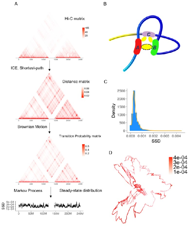 图 1:动态染色质可接近性模型和性质。A:SSD 的计算流程。Hi- C 矩阵经过最短路径法转换得到染色质区域的空间相互距离,再利用分子布朗运动的假设,得到马尔可夫模型的状态转移概率,最后得到分子在不同染色质区域的平衡态分布。B:最短路径算法示意图。C:SSD 值在染色质不同区域的典型分布。D:GM12878 细胞系 1 号染色体基于 Hi- C 数据的三维结构模型与 SSD(颜色)的关系。