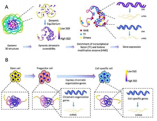 图 2:动态染色质可接近性的形成与在干细胞分化中作用的模式图。A:染色质三维结构通过动态染色质可接近性影响基因表达。B:干细胞分化过程中,动态染色质可接近性帮助阶段和细胞特异基因的时空表达。