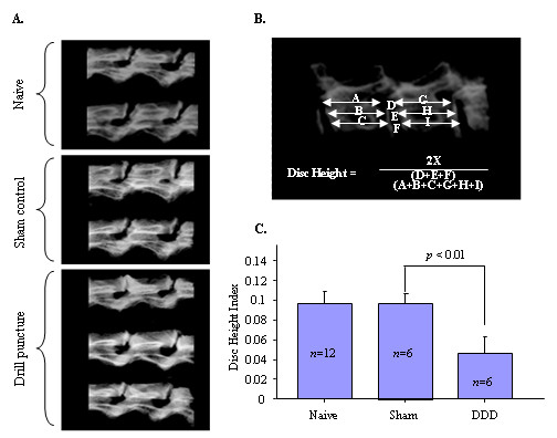 摘要:椎间盘退变能增加腰腿疼痛。为了深入了解生物过程之间的关系,结构上的改变和行为的痛苦,我们创建了一个大鼠动物模型。方法:椎间盘退变通过使用0.5-mm-diameter显微钻摘除腰椎间盘突出的髓核诱导。用痛觉测量外部压力对损伤的腰椎间盘产生的疼痛评估原发性痛觉过敏的程度。评价生化和组织学和受伤的腰椎间盘。通过对动物模型使用药物来调查慢性疼痛的治疗机制。结果:去除NP后,在背部下方施压出现痛觉过敏。手术后九周,我们观察到损坏或退化的间盘(蛋白多糖丢失和椎间盘高度缩小)。这些生物和结构的变化同间盘持续的痛觉过敏密切相关。高剂量的吗啡(6.7mg/kg)能有效的缓解疼痛。然而,高剂量的普瑞巴林(20 mg/kg),已用于慢性疼痛的治疗,以及抗炎药塞来昔布(50 mg/kg;选择性抑制剂环氧合酶2(COX-2))酮咯酸(20 mg/kg;COX-1和COX-2抑制剂),对间盘损伤动物没有显著镇痛作用。结论:虽然在基因表达谱的相似性表明在慢性疼痛通路与盘损伤或神经病变可能重叠,药物测试结果表明疼痛通路与这两种慢性疼痛的条件是完全不同的。我们的研究结果,为未来的研究新的治疗干预措施由于椎间盘退变导致改善患者的背部疼痛提供了基础。关键词:腰椎间盘退化 疼痛通路 慢性背部疼痛 动物模型 药物测试 疼痛干预简介:椎间盘是由一个坚韧的外环构成的独特结构,纤维环(AF),以及凝胶状的内芯,髓核(NP)。尽管在椎间盘退变过程有了深入研究,椎间盘源性腰痛的确切机制尚未阐明。椎间盘源性疼痛的许多功能尚未解释,包括少数患者严重的间盘退行性改变,严重的临床感染,慢性背部疼痛。动物疼痛模型对理解疼痛的复杂性和新疗法的开发和测试是必不可少的。通过观察人类的运动和反射的接触,以及通过要求患者报告他们的疼痛的质量和强度进行关节疼痛临床评估。动物疼痛可通过观察:1、疼痛相关的行为,如疼痛或舔或咬的嘶叫,受影响的肢体抖动;2、热或机械刺激的反应。兔椎间盘穿刺模型在椎间盘退变的生物学机制和椎间盘再生实验疗法的研究中是有益的。环形针穿刺后,兔子腰椎间盘逐渐退化。通过常规放射摄影术,磁共振成像(磁共振成像)和组织学检查,定量评估变性。然而,在这个模型中的椎间盘退变过程中兔子往往表现出最小的疼痛行为。当兔子感觉到痛苦,限制了他们的活动,并不能茁壮成长。兔子不显示疼痛行为;因此,它们不适合于椎间盘源性腰痛的研究。由于大鼠敏感的行为反应(例如,发声),大鼠模型已被广泛用于研究慢性炎症和神经性肢体疼痛和镇痛药的药代动力学研究。大多数的椎间盘退变的研究在大鼠尾,而不是在腰椎盘。部分原因是由于其解剖的可及性和最小的外科手术的发病率。大鼠尾部的椎间盘损伤可能会引起疼痛的反应。然而,不同于脊椎盘,尾盘不负重,目前尚不清楚神经解剖结构或参与的构件。因此,解释所产生的伤害性途径是相当困难的。最近的一项研究表明,衡量大鼠疼痛的行为模型可能适合研究椎间盘源性腰痛。他们称盘穿刺针(直径0.4毫米)诱导的大鼠可增加疏导和全身疼痛行为("湿狗")摇。在我们目前的研究中,我们试图在间盘结构建立一种新的疼痛和病理变化之间的相关性模型。我们开发的慢性椎间盘源性腰痛,是服从行为痛觉过敏动物模型的评价。我们研究了在间盘组件内的细胞和结构的改变和症状的慢性腰痛发展之间的生物联系。我们也描述疼痛调制器在背根神经节(DRG)和脊髓背部疼痛相关症状。我们进行了药理试验,探索潜在的治疗性镇痛调制的慢性背部疼痛。材料和方法:诱导间盘退化:成年SD大鼠,(250到300g),术前禁食24小时,更容易进行腹刺。动物进行麻醉,氧气(1升/分钟),1.5%氟烷通过面具维持麻醉。使用无菌技术进行手术。动物仰卧位,腹部毛发被剃光,用局部消毒液(葡萄糖酸氯己定)和酒精消毒三次,用手术刀片打开腹腔。腹中线切口约1.5至2厘米,腹部脏器轻轻挪开,观察到脊柱和腰椎的磁盘空间。脏腑灌溉预热无菌生理盐水并覆盖无菌纱布保持组织湿润。诱发椎间盘退变、盘穿刺显微钻(直径0.5毫米和0.25平方毫米的面积,相当于25号针头)插入椎间盘(L4、L5和L5、L6)至深度2毫米。通过使用聚乙烯塞套筒切割2毫米短于钻头的长度。肌肉是用丝线缝合,所有的皮肤边缘用4-0尼龙线缝合。取下麻醉面罩,放回干净笼中饲养。手术后两天,所有动物被注射丁丙诺啡0.1毫克/公斤,每日两次作为术后镇痛。动物进行监测,以确保有没有严重的损伤。另一组动物用一个更大的钻进行间盘穿刺。对于假手术对照组,间盘暴露同实验组相同的方式,但没有穿刺(每组12只)。椎间盘退变的生化,组织学和成像分析在下面的章节中描述评估。采用L5脊神经结扎产生神经性疼痛的动物模型比较椎间盘退变模型的组织蛋白和RNA水平。动物行为学测试:压力测试发声阈值:按0.5-cm2装置提示直接在背部皮肤上刺盘测量基于应力计的力的嘶叫阈,并同假手术对照组得到的阈值相比较。按照100g/s,力慢慢增加直到听到嘶叫。用1000g的切断力以防止组织损伤。进行重复试验,平均值为伤害性阈值。术后检测延迟至术后一周,允许腹部组织愈合。疼痛测试是临床相关的,因为患者的疼痛鉴于间盘上的机械压力测试,以评估他们的背部疼痛程度。机械性痛觉过敏:让大鼠适应钢丝网格覆盖透明塑料笼15分钟,一个校准的冯弗雷丝被应用从