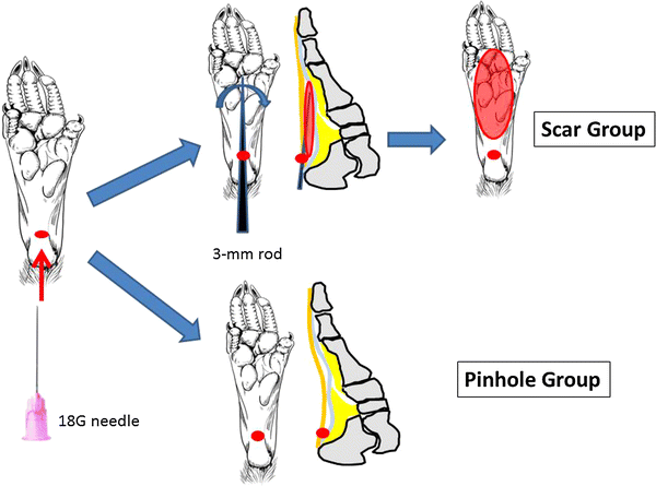 手术:所有大鼠腹腔注射戊巴比妥钠(50mg/kg)。在瘢痕组(n = 13,脚有痛苦的伤痕),在左足跟用18G针扎针孔(针孔组)。疤痕组是用钢棒在针孔处插入剥离皮下组织创建(= 3mm)。针孔组(为左脚,N = 13假手术),针孔是用18G针在左足跟制成(图1)。任何动物的右侧无外科手术。