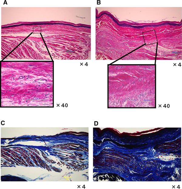 组织病理学:对足进行石蜡包埋,切成厚度为5-10微米切片。所有的组织进行连续切片,对左后肢足底形成的瘢痕组织进行苏木精-伊红(HE)和Masson trichrome染色。对瘢痕和针孔组的五只大鼠进行组织病理学检查。