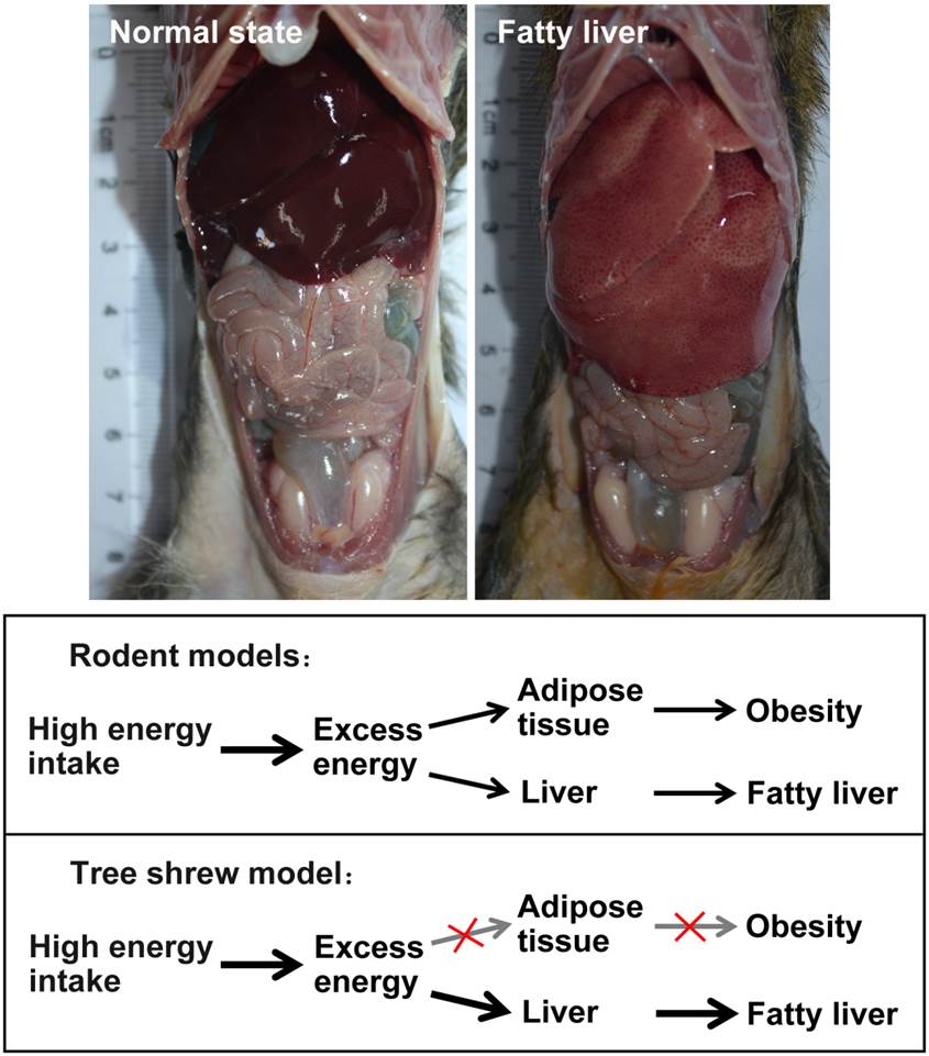 和常用的实验动物大鼠和小鼠相比,树鼩(Tupaia belangeri chinensis)在进化上更加接近灵长类。然而,作为一种新型的实验动物,我们不清楚,树鼩到底可以作为哪些人类疾病动物模型。中科院昆明动物研究所“脂类代谢与疾病”学科组前期开展了树鼩的体重、血糖、性别和年龄之间的研究,发现它们之间的关系和灵长类、人类很类似,提示树鼩可以作为研究代谢性疾病的动物模型(http://onlinelibrary.wiley.com/doi/10.1111/jpn.12036/abstract)。随后,他们用高脂高胆固醇食物诱导的方法成功建立了树鼩非酒精性脂肪肝动物模型,该模型能够模拟非酒精性脂肪肝的全部发病过程;比小鼠模型相比,其发病时间短,病症显著;并发现脂蛋白脂酶(LPL)在其发病过程中起着关键作用(http://www.nature.com/articles/srep15970)。