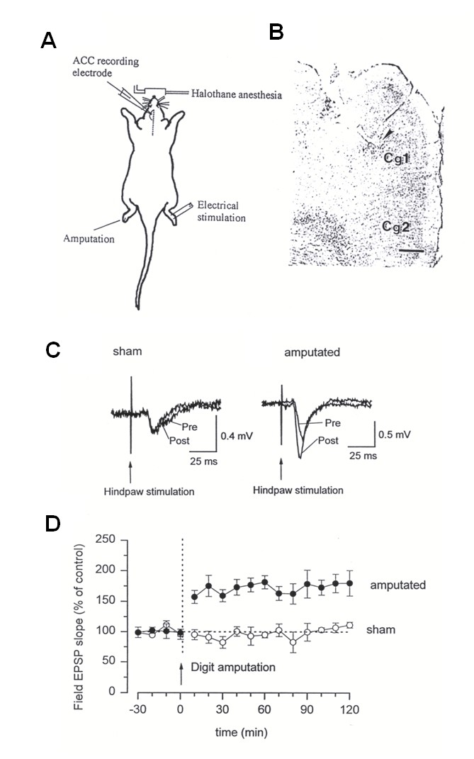 摘要: 慢性疼痛的动物模型被广泛用于研究慢性疼痛的基本机制,并评估潜在的新的治疗慢性疼痛的药物。用于测量慢性疼痛的不同的标准之中,行为反应通常被用来作为终点测量。然而,并不是所有的慢性疼痛情况可以通过行为反应被容易地测量的,如头痛,幻痛和疼痛相关的脊髓损伤。提出皮质指数在疼痛相关的皮质区的神经元的可塑性变化,可以作为用于慢性疼痛的终点测量。皮质指数不仅适用于缺乏动物模型支撑的慢性疼痛条件,也作为潜在药物治疗慢性疼痛的额外筛选方法。这些皮质指数是活动依赖性的即时早期基因、电生理鉴定的可塑性变化及信号蛋白的生化分析。它可以被用来评估新的作用于周围或脊髓部位的镇痛化合物。我希望,这些新的皮质终点测量将有助于我们的搜索新的,更有效的,疼痛的药物,并有助于减少虚假药物靶点。介绍:疼痛至少有两种不同的主要形式:急性疼痛,持续时间短,并经常作为保护和学习的信号。它也被称为生理上的疼痛,部分原因是由于其重要的生理功能。第二种形式是慢性疼痛,是持久的疼痛所造成的损伤组织或神经系统。虽然它也通知动物或患者受伤部位,慢性疼痛的长期成分不是生理上的关键,它会导致认知障碍,情感的痛苦,睡眠和情绪障碍的损失。因此,它也被称为病理性疼痛。由于缺乏对疼痛机制的细胞和分子机制的认识;黑盒实验研究疼痛的实验方法已被基础研究人员和药物开发人员广泛应用。许多不同的实验方法,其中,对伤害性刺激的行为反应或机械刺激后组织或神经损伤被广泛用于新药物的潜在镇痛作用的研究,常拟作为疼痛指标的终点。神经生物学方法的使用主要是针对疼痛传导的基本机理的研究,调制和可塑性;尚未使用或作为痛苦的终点测量。面临的问题:药物发现和转化医学研究:虽然慢性疼痛的动物模型,极大地促进了我们的理解基本的疼痛机制,仍然有许多主要的问题,使用动物行为模型不能解决。许多形式的临床疼痛无法模仿的动物模型。例如,它是很难衡量的截肢动物的痛苦;在脊髓损伤动物中测量伤害性戒断反应是不可能的。模仿头痛和慢性背部疼痛的动物也被证明是非常困难的,因为没有一个明确的行为与运动相关的运动反应,可以测量这样的痛苦。此外,即使在许多疼痛的条件下,在动物行为反应的疼痛的测量是可能的,疼痛指数往往会受到运动或前运动功能不必要的副作用。例如,在化疗引起的神经性疼痛的动物模型情况下,同样的化学物质也造成运动神经元/神经损伤。运动功能的缺陷直接影响伤害性反应的测量,如果只使用运动反应作为疼痛指数,如撤退阈值或延迟。大多数潜在的镇痛药物也作用于非选择性运动神经元。经典的疼痛终点---慢性疼痛的行为模型:行为研究已被广泛用于测量慢性疼痛的终点。大多数药物的药物发现主要集中在两个主要领域:目标蛋白和行为的终点。慢性疼痛动物模型中的行为评价作为临床前研究的终点。尽管行为测试有许多局限性(任何药物或基因突变的前运动或运动副作用都可以很容易地影响在自由运动条件下的行为反应)未提供一致的非行为终点的慢性疼痛也使药物发现变得复杂,很多潜在靶向药物在慢性疼痛动物模型中表现很好。皮层可塑性作为慢性疼痛的终点测量:提出使用皮层可塑性作为一个端点测量慢性疼痛,包括生化,电生理和成像测量。这种非行为的测量也可以在动物模型(如炎症性和神经性疼痛的动物模)被用来测量皮质反应,行为测试是适用的。在行为测量是不可能的疼痛类型情况下,这些皮质标记物可以用来评估疼痛。皮质长期变化可作为测量慢性疼痛动物模型药物作用的标志物。如果他们是潜在的镇痛药的慢性疼痛,作用于周围或脊髓水平的药物可能会减少或抑制这些激活的皮质。1、 活性依赖的即刻早期基因(IEG):活动依赖的即刻早期基因被中枢神经系统中的活动神经元激活。外周伤害性刺激或损伤引起c-fos和cAMP反应元件结合蛋白磷酸化激活(pCREB)在脊髓背角神经元。这种激活在脊髓背角神经元可以抑制或阻断药物或抑制行为敏感化。利用基因敲除小鼠实验表明,IEG激活量可能同疼痛行为表型相关。腺苷酸环化酶亚型1(AC1)或Ac1和AC8基因敲除小鼠表明:慢性炎性痛和神经病理性疼痛明显减少。在AC1,AC8,或Ac1和8双基因敲除小鼠(DKO),pCREB免疫后引起的炎症也减少了。类似于ACC,基因表达量也可能同疼痛行为表型相关。除了检测基线神经元损伤后的变化,动物在受伤后两周,IEG活性返回到ACC的基线水平。非伤害性刺激,通常没有引起任何明显的行为反应和基因表达。在成年大鼠神经损伤相似的研究报道,轻度伤害性刺激引发的皮层phosphorylated-c-jun活性显著激活。2、 皮层电位:谷氨酸位于皮质区,包括主要的兴奋性递质ACC。CFA注射引起的谷氨酸介导的兴奋性输入输出关系显著增强传输成年小鼠的ACC。在大鼠炎症动物中也发现了类似的变化。Bie等人发现:CFA大鼠炎症引发在ACC神经元增加AMPA受体介导的反应,观察的输入输出曲线左移。3、 在体内电生理作为慢性疼痛的直接证据:一个关键问题是是否损伤ACC的可塑性造成正常动物ACC突触传递的长期变化。为了测试这一点,我们使用麻醉大鼠进行了实验。我们测量周围的电击放置记录电极对麻醉大鼠ACC的突触反应。在高强度的刺激下,足以激活伤害性Aδ和C纤维,诱发
