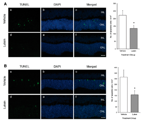摘要:视网膜脱离(RD)是导致失明的主要原因,虽然通过手术再附着率有很大提高,许多黄斑脱落视觉结果令人失望的,主要原因是感光细胞死亡。以前发现,在啮齿类动物的缺血/再灌注损伤模型中,叶黄素有抗凋亡作用。本研究的目的是调查叶黄素作为手术的一种可能辅助药物。方法:SD大鼠视网膜下注射1.4%透明质酸钠用于诱导视网膜脱落直至脱落约70%。诱导RD后4h内,每日腹腔注射玉米油(对照组)或含0.5mg/kg叶黄素玉米油(治疗组)。在视网膜脱落后第3天和第30天被安乐死,采用TUNEL染色和细胞计数对视网膜切片分析其视网膜外核层(ONL)感光细胞凋亡和细胞存活。通过免疫组化对神经胶质原纤维酸性蛋白(GFAP)和视紫红质(Rho)的表达进行分析。用抗激活型Caspase-3、激活型Caspase-8和激活型Caspase-9抗体进行的免疫印迹划定叶黄素在细胞凋亡中的作用机制。为寻求一个可能的治疗时间,相同的一组重复治疗实验在视网膜脱落(RD)后36小时开始。结果:RD后4h 给予叶黄素,与赋形剂组相比,RD后3天视网膜外核层有较少的TUNEL阳性细胞。细胞计数结果显示视网膜叶黄素治疗30天视网膜外核层有明显的核。治疗组也显著减少GFAP免疫反应和保存的Rho激酶的表达。RD后3天,免疫印迹显示治疗组的激活型Caspase-3和激活型Caspase-8表达减少。激活型Caspase-9没明显变化。在RD后36h时给予叶黄素,也观察到类似的结果。结论:研究结果表明,叶黄素是一种有效的神经保护剂,可以补救RD大鼠的感光细胞,至少在视网膜脱落36h内有效。叶黄素可以作为RD病人术后辅助药物,来改善视觉效果。关键词:细胞凋亡 叶黄素 透明之酸钠 视网膜神经元 视网膜脱落 叶黄素的神经保护作用介绍:视网膜脱离(RD),定义为视网膜神经上皮层与底层的视网膜色素上皮细胞分离,可造成毁灭性的视觉损失。随着外科技术的进步,复位率大大增加,尤其是多次手术后。然而,最终的视觉效果仍然令人失望,尤其涉及视网膜黄斑脱离。即使全视网膜复位,术后视力长期维持在0.2到0.4的范围内。感光细胞凋亡已被假定为视觉损失的主要原因,除了在视网膜上的其他结构的变化,如神经胶质疤痕。为达到更好的视觉效果,防止或减少感光细胞死亡的神经保护作用也因此成为了研究的重点。叶黄素,类胡萝卜素类色素,通过长期的、大规模的随机、安慰剂对照试验已被证明对降低年龄相关性黄斑变性(AMD)风险有效。Krinsky回顾了叶黄素和玉米黄质对防止眼睛黄斑变性的生物学机制。此后,叶黄素已被作为一种抗氧化剂和抗炎剂的神经保护剂在不同的疾病模型中被研究,包括糖尿病性视网膜病变,葡萄膜炎,视网膜光损伤与缺血/再灌注损伤。叶黄素已被证明,不仅对RPE细胞有效,而且对其他细胞成分包括神经节细胞层,内丛状核,甚至感光细胞有效。叶黄素也被证明有抗氧化功能。它吸收蓝光,包含双键,淬灭活性氧,减少氧化应激。活性氧清除剂和抗氧化剂可能对RD有保护作用。RD,底层的神经视网膜RPE分离剥夺了感光细胞的氧气和营养供应,诱导缺氧环境下活性氧和氧化应激的产生,最终导致感光细胞死亡。叶黄素保护感光细胞免受氧化应激诱导的细胞死亡。方法:动物和研究设计:选用雄性SD大鼠(200-250g),饲养在温控房间内,大鼠被分层两组,治疗组接受含叶黄素的玉米油和一个赋形剂组接受玉米油。右眼(OD)诱导的视网膜脱离,而左眼(OS)作为对照组。进行四个独立的实验:前两个评价视网膜脱离后4h给予叶黄素的短期和长期的影响.后两个评价视网膜脱离后36h给予叶黄素的短期和长期的影响。视网膜脱落实验模型:大鼠腹腔注射甲苯噻嗪(7 mg/kg)和氯胺酮(70 mg/kg)混合剂麻醉。局部麻醉(1%盐酸丙美卡因)和散瞳剂(1%托吡卡胺)应用到右眼。做一个小的角膜切除术是为了在这个过程中释放眼压。在手术显微镜下观察眼底,凝胶4000应用于眼。大鼠右眼睛巩膜和视网膜上边缘下约2毫米,用30号针头机械性诱导视网膜脱离。通过模拟视网膜裂孔的视网膜切开术,针然后缩回到视网膜下的空间,透明质酸钠被注入直到引起70%的视网膜脱落,模仿孔源性视网膜脱落。手术显微镜下进行检查,并为每一只动物拍摄一张眼底照片。预防性抗生素(妥布霉素软膏)被应用于预防术后感染。动物进行定期监测直到他们恢复意识及进行日常术后护理。治疗:20%叶黄素玉米油悬浮液。治疗组 用纯玉米油将浓度0.5mg/kg叶黄素稀释至0.3mg/ml。赋形剂组给予相当数量的玉米油,所有治疗均给予腹腔内注射。组织收集与处理:在不同的时间点,用过量戊巴比妥钠处死动物。检查眼睛视网膜脱落的高度和用6-0可吸收缝合线被缝合到每只眼的鼻结膜来标记解剖位置。摘除眼球,角膜和晶状体被仔细移除。在4°C,用4%多聚甲醛在磷酸盐缓冲液(PBS, 0.01M,pH 7.4)固定眼球。使用乙醇和氯仿进行一系列脱水,石蜡包埋用切片机切成6μM矢状断面。组织学分析:视网膜切片脱蜡和苏木精-伊红染色(HE)。在三个不同的位置对外核层(ONL)厚度和单位面积细胞计数进行量化。中央(100-150μM距视神经),外周(100-150μM距锯齿缘)和中周(在中枢和外周之间)。每只眼睛随机选择两个有代表性的部分,进行测量和算平均值。仅对视神经盘的视网膜部分进行分析,不脱落的地区被排除在外。TUNEL法:TUNEL法根据说明书对凋亡细胞进行量化。每只眼睛随机选择两个有代表性的部分。同样,视网膜切片选择显示视神经盘部分。
