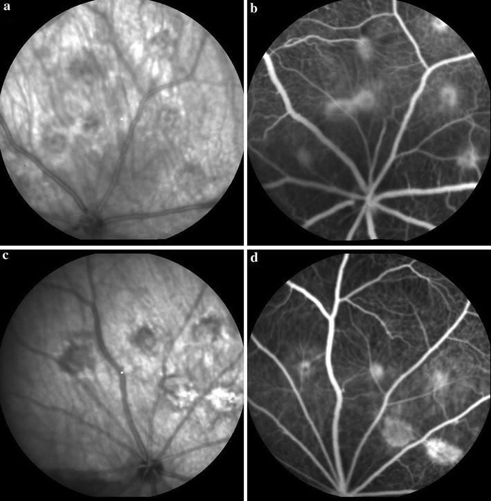 荧光素血管造影评价脉络膜新生血管:激光应用四周后,FAG激光烧焦的点显示CNV的发展。伊马替尼注入的眼睛的平均得分与对照组没有显著差异。