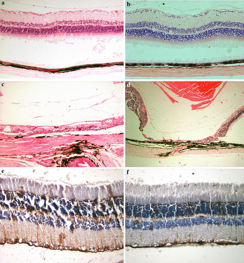 组织病理学和免疫组织化学检查:ERG记录后,将动物处死,摘除眼球10%福尔马林固定,5?M组织切片后HE染色光镜下检查。观察视网膜层的完整性和视网膜出血,炎症和萎缩。此外,进行胶质纤维酸性蛋白(GFAP)的免疫组化研究(多克隆抗胶质纤维酸性蛋白、)组没有任何病理变化。与对照组相比,治疗组视网膜Muller细胞明显增加GFAP免疫反应。组织病理学变化表明视网膜毒性包括:视网膜层不完整性,视网膜出血的存在,和/或炎症、视网膜神经胶质增生或萎缩的存在和GFAP免疫反应存在显著。