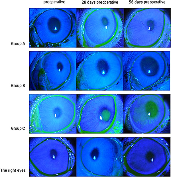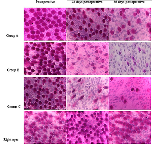 结膜印迹细胞学检查:结膜印迹细胞学检查针对角膜上皮细胞杯状细胞密度和上皮细胞化生的评价。左眼和对照组眼睛在基线杯状细胞密度无显著差异。14,28,42,和56天B组和C组的杯状细胞密度与基线细胞密度相比显著降低。在28天,42,和56,A组的杯状细胞密度同基线相比显著偏低,42、56天组间杯状细胞密度无意义。与对侧对照组的眼睛相比,28,42,56天每个组(左)眼睛杯状细胞密度显著减少。B组和C组同对照组相比,14天手术左眼的杯状细胞密度也显著降低。在14,28,42,和56天,B组和C组的左眼睛的杯状细胞密度比A组显著降低。