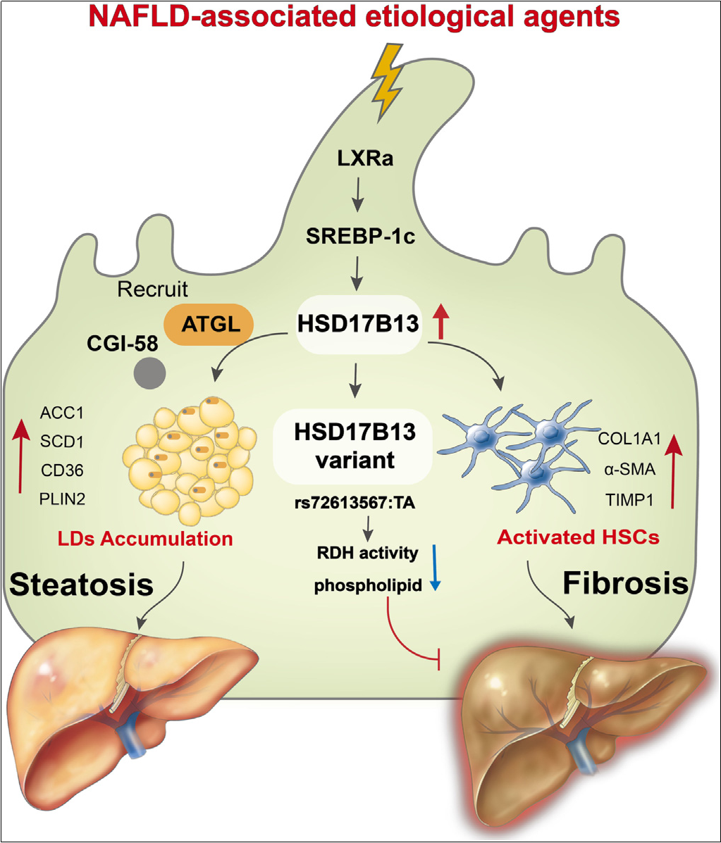 图2 HSD17B13在代谢功能障碍相关性脂肪性肝病(MASLD/NASLD)进展过程中的作用[8]