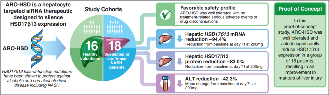 [9]Mak LY, Gane E, Schwabe C, Yoon KT, Heo J, Scott R, Lee JH, Lee JI, Kweon YO, Weltman M, Harrison SA, Neuschwander-Tetri BA, Cusi K, Loomba R, Given BD, Christianson DR, Garcia-Medel E, Yi M, Hamilton J, Yuen MF. A phase I/II study of ARO-HSD, an RNA interference therapeutic, for the treatment of non-alcoholic steatohepatitis. J Hepatol. 2023 Apr;78(4):684-692.