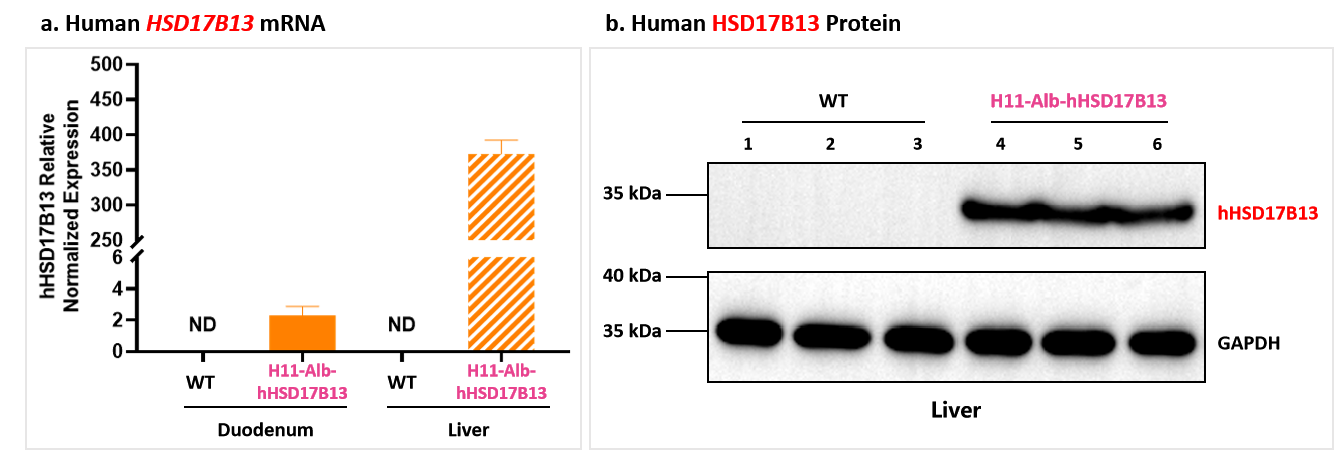 检测结果表明,H11-Alb-hHSD17B13小鼠在肝脏和十二指肠均成功表达人源HSD17B13基因,且在肝脏中检测到人源HSD17B13基因和蛋白的显著表达。