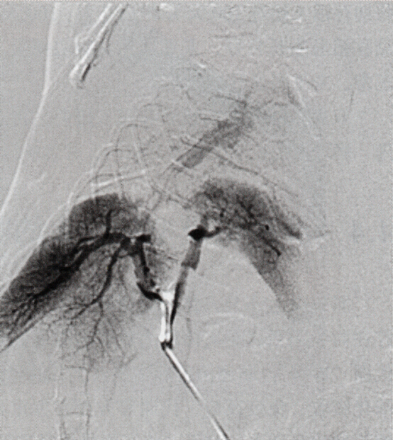 图4-4 B:大鼠双肝移植后肝胆管系统DSA检查,显示胆管系统是通畅的