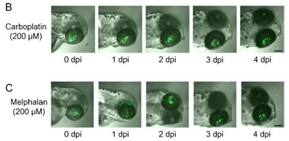 更重要的是,Dong等用抗癌药卡铂和马法兰对视网膜母细胞瘤细胞原位移植的斑马鱼进行了治疗后,发现癌细胞数量明显减少(见下图)。