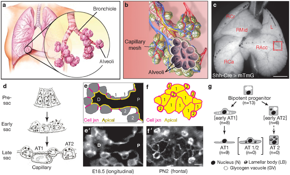 Mark Krasnow及同事采用肺泡标记物、遗传世系追踪和克隆分析来在小鼠整个生命周期中对肺泡祖细胞进行活体识别。他们发现,AT1和AT2细胞是在发育过程中从一种“双潜力”祖细胞形成的。在出生后,成熟AT2细胞起“兼性”干细胞的作用,形成再生肺泡的慢慢增大的单克隆位点。