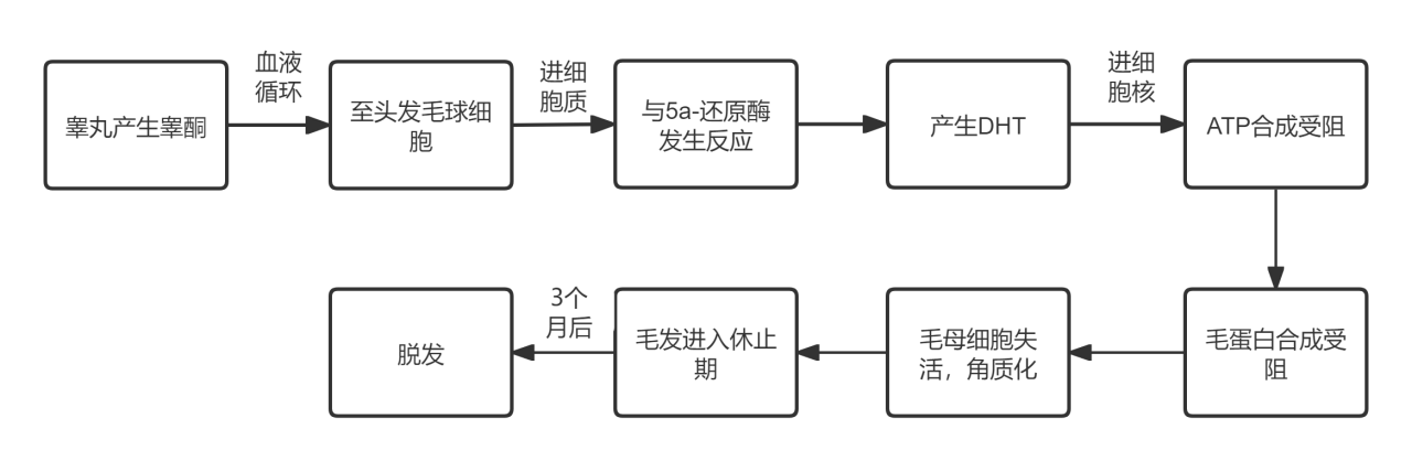 睾丸产生睾酮男性荷尔蒙,随血液循环达毛球细胞,与细胞质中的5a-还原酶反应,变成荷尔蒙作用增强的DHT(双氢睾酮),后进入细胞核,使得ATP产生受阻,进而阻止毛发蛋白的产生,毛母细胞失活角质化,进入休止期,大概3个月就会脱发。总而言之这一切的“幕后推手”5α-还原酶,正将睾酮转化为DHT,成为脱发链条的关键一环。
