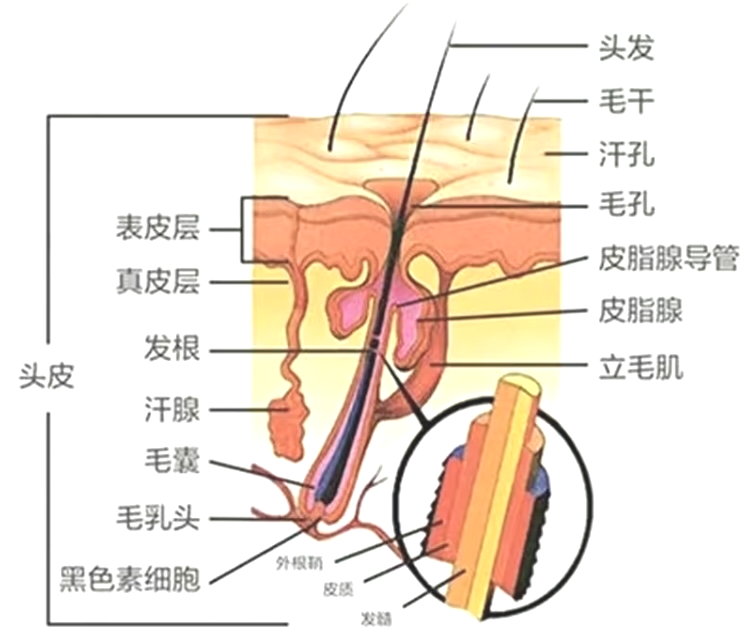 1)毛发是由毛干、毛根、毛囊、毛球以及毛乳头组成的。其中毛干包括毛髓质(营养物质的输送)、毛皮质(含大量色素颗粒,决定颜色和质地)和毛鳞片(角化细胞组成,主要作用保护头发);毛乳头内含毛细血管和神经末梢,制造黑色素。