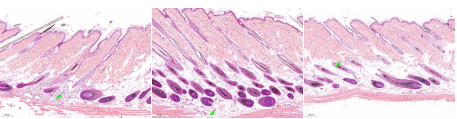 由上图可知,对照组小鼠在Day11开始毛发逐渐生长,至Day15脱毛区皮肤毛发均长出;在Day15时,与对照组相比较,模型组小鼠脱毛区皮肤几乎没有毛发生长,毛发还处于休止期;在Day15时,与对照组相比,米诺地尔组小鼠的脱毛区皮肤基本生长出毛发,毛发处于生长期。