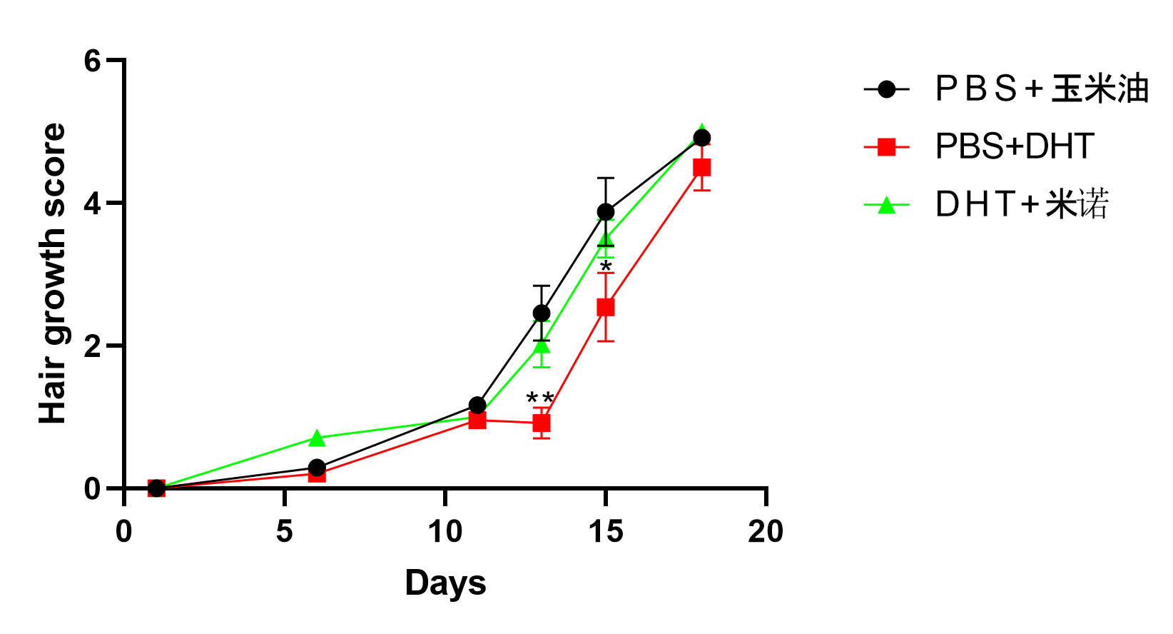 在Day15时,与对照组相比较,模型组的小鼠的毛发生长评分明显减小且具有显著性差异(P<0.05);在Day15时,与对照组相比较,米诺地尔治疗组的小鼠的毛发生长评分减小但没有实际生物学统计意义(P>0.05);在Day13时,与模型组相比较,米诺地尔治疗组小鼠的毛发生长评分增大但没有实际生物学统计意义(P>0.05)。