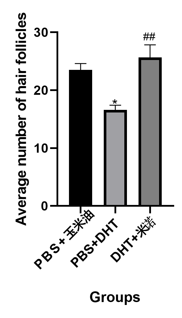 注:PBS+玉米油为对照组,PBS+DHT为模型组,DHT+米诺为米诺地尔治疗组;*表示与对照组相比较,#表示与模型组相比较