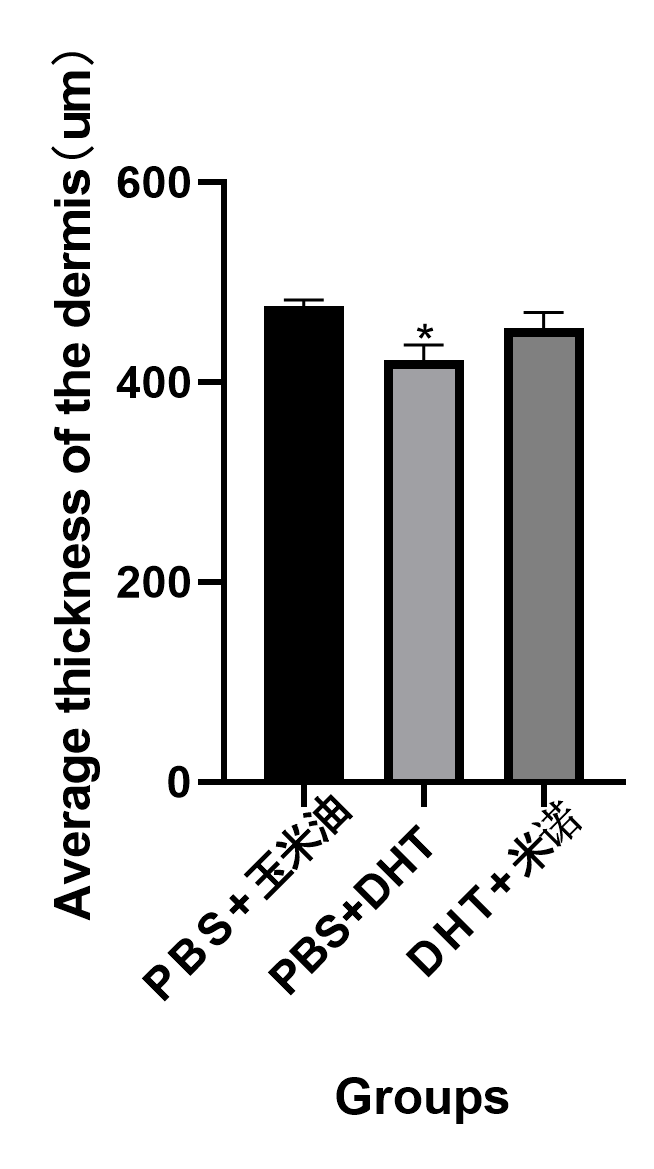 结果分析:由上图可知,与对照组相比较,模型组的小鼠的平均真皮层厚度减小且具有显著性差异(P<0.05);与对照组相比较,米诺地尔治疗组的小鼠的平均真皮层厚度减小但没有实际生物学统计意义(P>0.05);与模型组相比较,米诺地尔治疗组小鼠的平均真皮层厚度增大但没有实际生物学统计意义(P>0.05)。