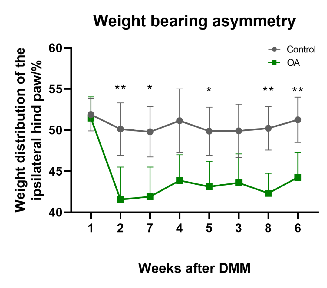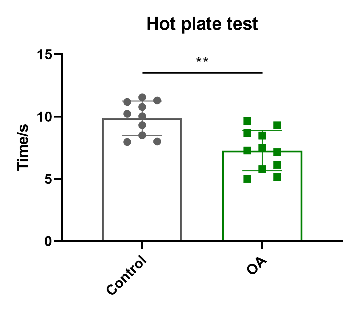 通过刺痛、热板、双足负重平衡、膝关节压痛等测试,提示OA模型组实验动物出现明显痛觉敏化。番红固绿及苏木素/伊红染色结果提示OA模型组实验动物膝关节表面软骨出现明显损伤和滑膜炎症。