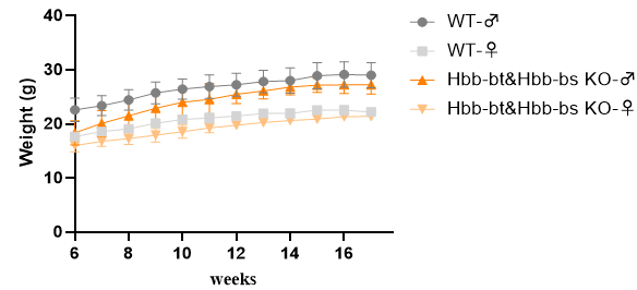 图1 杂合Hbb-bs&Hbb-bt DKO小鼠和野生型(WT)小鼠的体重变化曲线,雌性和雄性杂合Hbb-bs&Hbb-bt DKO小鼠均呈现和野生型小鼠较为一致的生长状况。