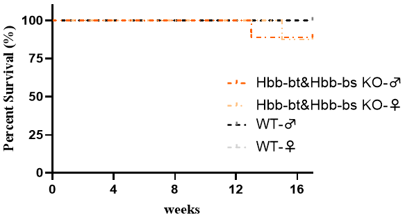 图2 杂合Hbb-bs&Hbb-bt DKO小鼠和野生型(WT)小鼠的生存曲线,雄性杂合Hbb-bs&Hbb-bt DKO小鼠在第13周开始出现死亡情况,雌性杂合Hbb-bs&Hbb-bt DKO小鼠在第15周开始出现死亡情况。