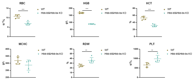 血常规检测结果表明,与野生型小鼠相比,杂合Hbb-bs&Hbb-bt DKO小鼠的红细胞计数(RBC)、血红蛋白含量(HGB)和红细胞压积(HCT)显著下降,平均红细胞血红蛋白浓度(MCHC)略有下降,而红细胞分布宽度(RDW)和血小板计数(PLT)明显上升。这些参数变化与相似基因突变类型导致的β地中海贫血临床表型相似。