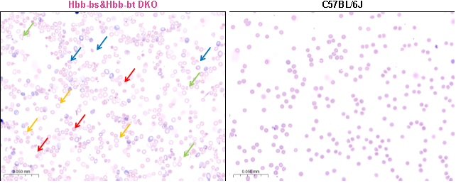 血涂片分析结果显示杂合Hbb-bs&Hbb-bt DKO小鼠有核细胞数占比增加,红细胞中央浅染区扩大且出现较多异形、碎片红细胞和有核红细胞。其外周血中存在靶形红细胞(黄色箭头)、棘形状红细胞(红色箭头)、泪滴状红细胞(绿色箭头)和破碎状红细胞(蓝色箭头)等多种异常形态红细胞。C57BL/J野生型小鼠红细胞形态结构完整,呈现双凹圆盘状且未见明显异常。