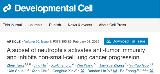 1.Tang Z, Hu J, Li XC, Wang W, Zhang HY, Guo YY, Shuai X, Chu Q, Xie C, Lin D, Zhong B. A subset of neutrophils activates anti-tumor immunity and inhibits non-small-cell lung cancer progression. Dev Cell. 2025. https://doi.org/10.1016/j.devcel.2024.10.010