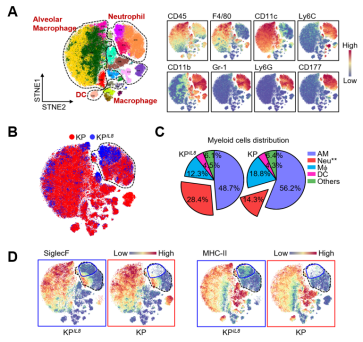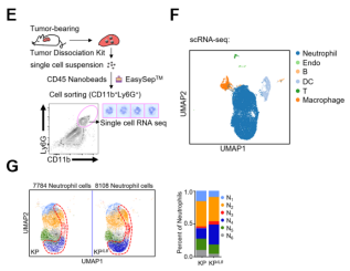 针对上述问题,研究人员首先分析了人非小细胞肺癌组织中IL-8的表达,确定了IL-8在肺肿瘤微环境中的细胞分泌来源-中性粒细胞。随后,研究人员构建了过表达人IL8的非小细胞肺癌模型小鼠(EGFRTD/IL8或KPIL8小鼠)进行成瘤实验,揭示了IL-8在抑制非小细胞肺癌肿瘤进展中的功能。质谱流式与单细胞测序技术结果表明,一群具有抗原递呈相关分子特征的中性粒细胞-CD74highSiglecFlow中性粒细胞在过表达IL8小鼠肺部肿瘤组织中显著积累,暗示IL-8与CD74highSiglecFlow中性粒细胞之间具有密切联系。