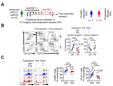 紧接着,研究人员在人非小细胞肺癌肿瘤微环境中鉴定到一群在功能上与小鼠CD74highSiglecFlow中性粒细胞高度相似的中性粒细胞亚群 (CD74highCD63low)。人外周血中性粒细胞含量极为丰富,是一项极具潜力的预测生物标志物,为探究CD74highCD63low中性粒细胞预测治疗非小细胞肺癌疗效的潜力,研究人员进行了一项前瞻性临床观察实验。实验结果表明,外周血中CD74highCD63low 中性粒细胞与接受基于anti-PD-1的新辅助治疗的晚期非小细胞肺癌患者的预后呈正相关,可作为一种潜在的预测非小细胞肺癌治疗疗效的生物标志物。