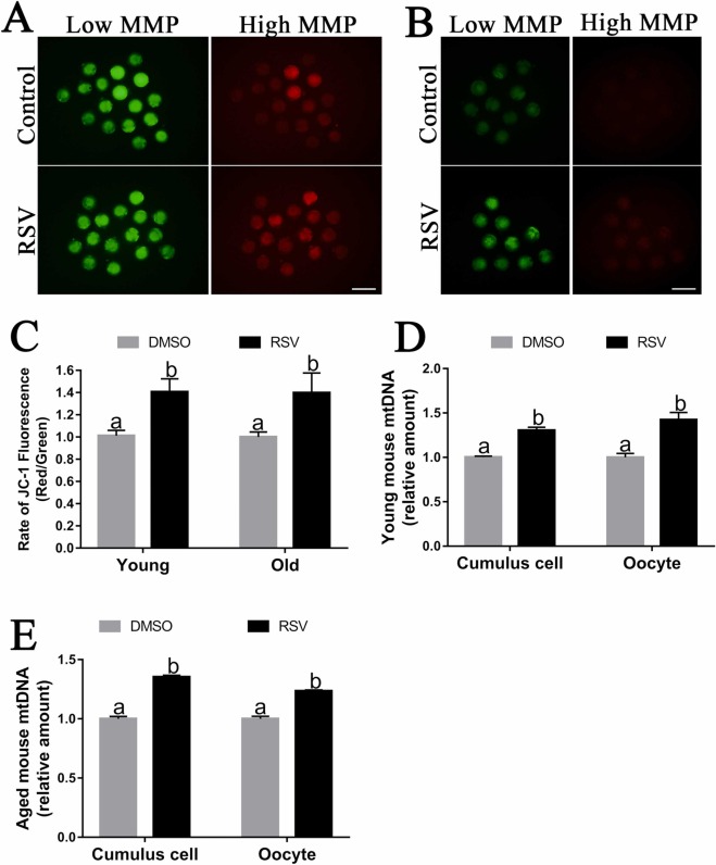 RSV对年轻和老年小鼠卵母细胞MMP和mtDNA拷贝数的影响:为了进一步观察补充 RSV 对卵母细胞线粒体生物发生和功能的影响,定量分析了 MMP 和 mtDNA 的相对含量。结果表明,无论是年轻小鼠还是老年鼠,RSV组的MMP和mtDNA的相对量均显着高于对照组,卵丘细胞也是如此。