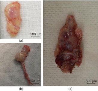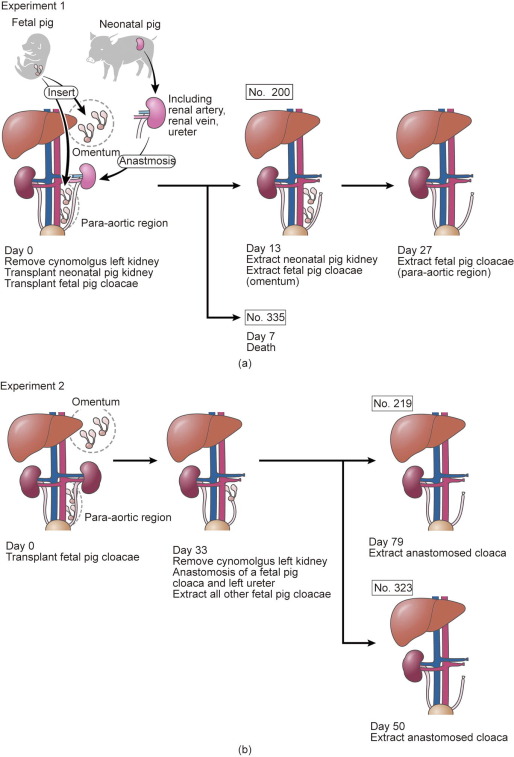 输尿管形成后主动脉旁胎儿肾的回收:移植后50或79天,通过腹部中线切口重新打开腹部。剖腹术后手动移动大网膜和肠道,并确定主动脉旁区域的移植组织。识别后结扎右肾动脉,从静脉输注约100 mL细胞外液(生理盐水、葡萄糖和VITAMEDIN®)以及呋塞米(20 mg)和靛蓝胭脂红(20 mg)。观察 > 15 分钟后,评估移植组织的尿液产生量。 随后,将移植的组织从周围组织中解剖出来并回收,完成了实验。