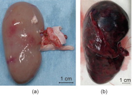 图 3、 实验 1 中移植的新生儿肾脏。 (a) 移植前; (b) 移植后 13 天。