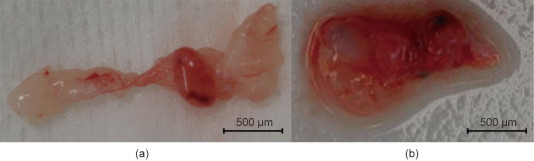 图 4 、实验 1 移植的胎儿排泄器官。 (a) 移植后 13 天; (b) 移植后 27 天。