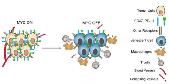 在小鼠癌症模型中,MYC持续的过表达与肿瘤生长相关。斯坦福医学院的Dean Felsher和他的同事前期研究表明,当像 Myc一样的致癌基因被灭活时,只有在免疫系统开启的情况下(包括CD4+ T细胞的激活和募集),某些小鼠肿瘤才能够被彻底被清除。Felsher说:“我们最初观察发现,在免疫缺陷的小鼠中,即便关闭了MYC,肿瘤也同样不能被击退。”