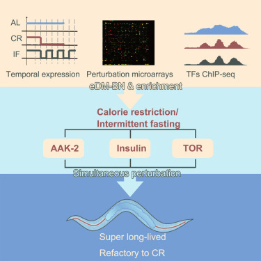 韩敬东团队利用无偏的系统生物学方法研究秀丽隐杆线虫的节食调控网络,发现了三个转录调控模块,最终通过对这三个模块同时进行遗传学干扰,得到了对节食的延寿效应不敏感的寿命超长的线虫。