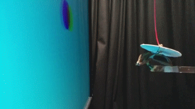 接下来,就要验证螳螂3D眼镜的效果了。研究者在屏幕上分别打出了蓝绿两色的图像,并控制图像的位置,使它们形成3D影像时看起来恰好“漂浮”在螳螂面前约2.5厘米的地方。结果显示,螳螂们的表现正如预期:它们对较远处屏幕上的2D图像没有什么反应,而当戴上眼镜,面对看起来“近在眼前”的3D图像时,它们挥舞起前肢,给出了更多的回应。