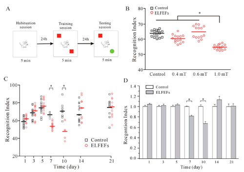 研究已表明,动物暴露在电磁场可能会干扰脑细胞的活性,从而产生行为和认知障碍。可是,导致该研究结果的潜在机制和可能的预防措施仍然未知。在这项研究中,采用小鼠模型来研究极低频率(50 Hz)电磁场(ELF MFs)暴露对识别记忆功能和海马神经元形态变化的影响。数据表明,暴露于电磁场(ELF MFs)(1 mT,12小时/天)在新物体联想识别记忆可诱导时间依赖性缺陷,同时也可降低海马树突棘的密度。这种效应在自发活动发生中没有观察到相应的变化,或者这种效应是短暂的,仅在小鼠暴露于ELF MFs 7~10天后可观察到。海马神经突蛋白(一种活性依赖性神经营养因子)利用相关腺病毒(AAV)载体过表达,显著增加神经突蛋白水平和树突棘密度。这种增加与电磁场(ELF MFs)暴露诱导的识别记忆缺陷和树突棘密度降低是相关的。总之,这项研究为电磁场(ELF MFs)暴露和识别记忆障碍、海马树突棘密度变化之间的关系提供了证据,神经突蛋白通过增加海马棘密度而阻止电磁场(ELF MFs)暴露的诱导作用。