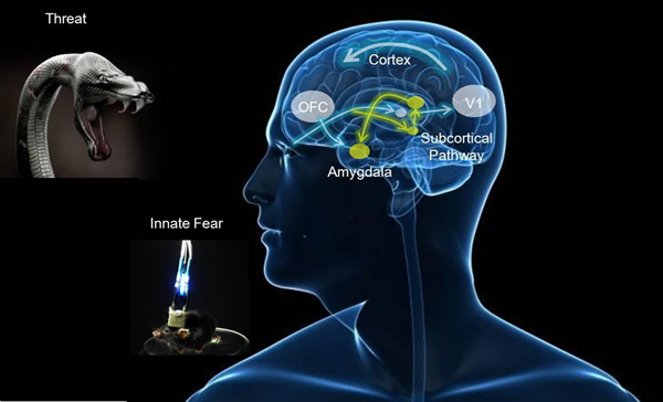 研究成果示意图:用光感基因神经调控技术毫秒级精准,细胞特异的解析出一条皮层下神经通路(黄色线路),可以不经过视觉皮层到达情感中枢杏仁核。此快速通路,可以特异性处理小鼠对视觉威胁刺激的本能恐惧反应。用光感基因神经环路调控的方法实现了精准"开"与"关"这一行为。本能的恐惧反应,对物种的生存与繁衍至关重要。