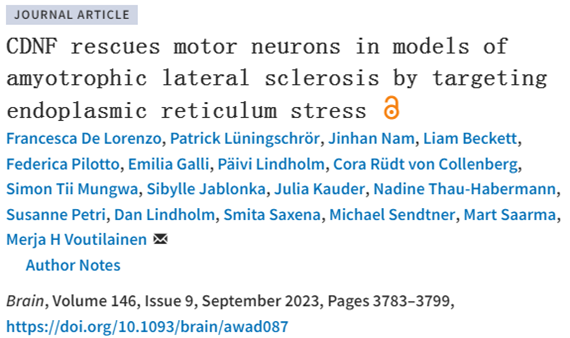 在一项新的研究中,来自芬兰赫尔辛基大学等研究机构的研究人员发现了一种治疗肌萎缩性侧索硬化症(amyotrophic lateral sclerosis, ALS)的候选药物。在动物实验中,脑多巴胺神经营养因子CDNF可延长大鼠和小鼠的寿命并减轻疾病症状。相关研究结果发表在2023年9月的Brain期刊上,论文标题为“CDNF rescues motor neurons in models of amyotrophic lateral sclerosis by targeting endoplasmic reticulum stress”。论文通讯作者为赫尔辛基大学助理教授Merja Voutilainen博士。