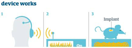 事先,在鼠身上安装一个小的植入装置,这个装置包括:镀铜卷板、一个发光二极管(LED)和一个含有转基因细胞的容器。当鼠下面的电磁场转换的时候,植入线圈会产生感应电流,而LED也会发出一束红光。光束照亮那些细胞,造成一种新的蛋白质从植入膜中渗透出来。至于细胞,他们本来就是用来回应这种反应的,只不过是通过在特定基因上的转换罢了。