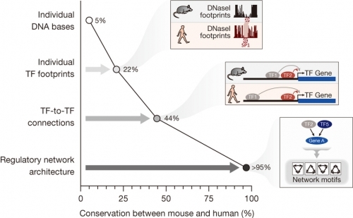 在此提出的数据集将对尝试理解哺乳动物调控DNA是如何演化的研究人员有用。有关哺乳动物中数千个基因是如何通过像增强子和启动子(它们控制着基因表达)等DNA成分进行调控的研究因为缺乏可在人与小鼠间进行比较的来自不同细胞类型的详细的调控DNA图而一直受到限制。