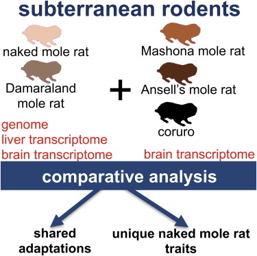 全球大约有250种地下鼠,广泛分布在除了南极洲和澳大利亚的其他大陆上。非洲鼹鼠是地下鼠的一个分支,具有长寿,终生生活在地下以植物块茎为食等特性。它们所处的环境——低氧、高氨、高二氧化碳,而在这种环境中,大鼠,小鼠等地上鼠无法存活。目前,只有一种非洲鼹鼠——裸鼹鼠的基因组被公布。为了更好的了解非洲鼹鼠的遗传特性,该研究团队对另一种非洲鼹鼠——达马拉鼹鼠进行了测序,并优化了裸鼹鼠的基因组序列。