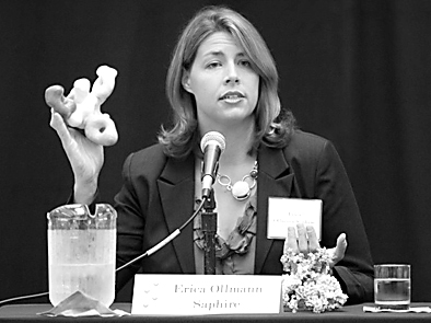 加州圣地亚哥市斯克利普斯研究所的Erica Ollmann Saphire展示一个埃博拉病毒表面蛋白的模型。图片来源:MELISSA JACOBS
