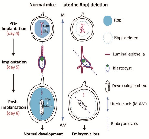 进一步通过体外生化实验、notch通路转基因小鼠模型以及药理实验发现:RBPJ在植入前的子宫中通过与雌激素受体 (ERα) 结合,调节雌激素效应基因的表达进而促使子宫腔从分支样结构变为狭缝状。RBPJ缺失的子宫腔由于保留多余的分支(与子宫轴方向不一致),形成一个个“陷阱”,落入这些“陷阱”的胚胎由于建立了错误的发育轴向而走向死亡。 此外,研究组还进一步发现RBPJ在植入后的子宫中通过转录调控基质金属蛋白酶(MMP)的表达对子宫基质蜕膜进行改造,使子宫蜕膜的改造进程与胚胎轴向的延伸协调同步。这些证据表明RBPJ对围植入期的子宫进行阶段特异的改造,实现植入期胚胎的正确定向以及植入后蜕膜期的正常发育。