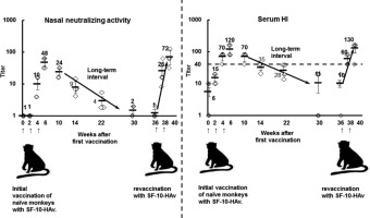摘要:用来自肺表面活性物质成分的新型黏膜佐剂SF-10对12只雄性食蟹猴经鼻滴入流感疫苗后的全身和粘膜免疫和记忆功能的研究。流感病毒A/加利福尼亚/7/2009(H1N1)PDM血凝素疫苗(HAV)在含15μg或不含SF-10和佐剂单独作用下,每2周滴入鼻腔三次。相比于单独的HAV抗原及SF-10,含SF-10佐剂HAV(SF-10-HAV)引起血清明显的HAV特异性IgG和血凝抑制(HI)滴度,鼻洗液中出现HAV特异性分泌型IgA和中和活性。血清HI抗体效价和中和活性达到峰值水平在鼻腔冲洗的初始接种后6周,然后逐渐下降,在10周和36周恢复至基线水平。SF -10-HAV在36周经鼻内再次快速接种,显著提高了血清和鼻腔的免疫力。一次或两次剂量的再接种在灌洗后2或4周达到几乎最大的免疫力。接种SF-10-HAV,HAV或SF-10以及在实验期间,未观察到显著的不利影响(例如,体重减轻,体温升高,鼻分泌物、外周血白细胞及血小板计数变化)。结果表明,临床应用SF-10于鼻腔流感疫苗的潜力。关键词:黏膜佐剂 鼻腔流感疫苗 肺表面活性剂 再接种 食蟹猴简介:通过对幼龄食蟹猴进行鼻内给予SF-10-HAV,评价合成SF-10佐剂对全身和局部免疫的影响,以及再接种对其记忆的效果;猴模型具有灵长类动物模型的优点,它允许在很长一段时间内连续血清和鼻腔采样,并进行再接种。动物:12只雄性食蟹猴,30-32月龄,体重2.1-2.8kg。用酶联免疫吸附试验测定每只猴子血清和鼻腔冲洗液确认为流感血清阴性。肌肉注射10 mg/kg氯胺酮和80μg/kg甲苯噻嗪对动物进行麻醉,测量体重直肠温度。在接种前的第2天,对所有猴子的鼻腔冲洗液和血清再次检测HAV抗体。抗原、SSF和SF-10-HAV的制备:IAV/加利福尼亚/7/2009(H1N1)PDM乙醚裂解抗原(15μg HA,相当于30.8μg病毒蛋白)被用作HAV抗原。冻干法制备了SSF-HAV复合物。冻干的SSF HAV通过温和混合溶解在生理盐水中,在盐水中加入CVP(pH 7 - 7.5),最终浓度为0.5%以增加粘度。SSF佐剂和CVP增稠剂的混合物改名为SF-10。SF-10-HAV的最终用于鼻免疫接种。接种:鼻内接种疫苗,滴鼻免疫50μL的准备SF-10-HAV到麻醉动物发每个鼻孔,每两周内进行免疫三次,每次动物在含或不含SF-10情况下,接种15ugHAV。所有的动物都表现出明显的全身和粘膜免疫诱导。在第一次接种SF-10-HAV后36周和38周,对动物进行一或两个剂量的SF-10-HAV再接种。样品收集:从每个动物收集血清和鼻腔物来评估抗体反应。为了收集麻醉动物的鼻腔冲洗液,将0.25毫升无菌生理盐水注入鼻孔,然后轻轻移动头部。通过硅胶管收集。对硅管内用1毫升生理盐水冲洗,收集。将鼻腔分泌物立即置于冰上, 500G离心5分钟,上清液贮于-30°C,直至使用。股静脉采血,离心收集血清。为了监测疫苗接种的不良影响,还采集血液样品,在接种前第3天和接种后第1, 15天和第29天进行血液计数分析。酶联免疫吸附试验:通过ELISA方法检测血清和鼻腔洗液中的抗体。血凝抑制试验:使用RDE(II)"SEIKEN"在37度时对血清样品过夜处理来消除非特异性HI因素,简单地,在96孔板的每个孔中加入疫苗抗原的4个HA单位和1%的洗涤的鸡红细胞,然后稀释试验血清,然后在室温下孵育30分钟。HI终点滴度被确定为最高血清稀释度的倒数,产生血凝活性完全抑制。鼻腔分泌物的中和活性:为了测量鼻腔分泌物的中和活性,将200个H1N1PDM的噬斑形成单位(PFU)与100μL连续稀释的鼻腔冲洗液在冰上孵育2小时,然后,通过对马丹-达比犬肾细胞的斑块测定来测量混合物中的病毒滴度。结果:血清和鼻腔冲洗液HAV特异性抗体反应动力学:通过食蟹猴评价SF-10黏膜佐剂作用,我们分析了鼻内滴入SF-10-HAV后在鼻冲洗液抗HAV S -IgA和血清IgG诱导的时间过程。在第二次接种SF-10-HAV后4周观察到抗HAV S -IgA滴度的显著诱导,在第三次接种后6周检测到指数的进一步增加。鼻腔滴注HAV或SF-10后,鼻腔冲洗液中抗HAV-S IgA滴度无明显诱导。表二显示血清抗-HAV IgG滴度的连续变化。在第二次接种SF-10-HAV后4周观察到抗HAV IgG滴度的显著和指数诱导,诱导滴度接近最大值。在一些动物中发现滴度的延迟增加,在第三次接种后第6周达到高峰水平。第二次接种后滴度接近最大的动物在第三次接种后滴度没有进一步增加,接种后4~6周的诱导谱呈现出高原。单独接种HAV或SF-10疫苗后,血清中抗HAV IgG滴度无明显诱导。血清HI滴度和鼻腔洗液中和活性的诱导:我们分析了血清HI滴度的系列变化和鼻腔冲洗中的中和活性。在第二次接种后4周内,用SF-10-HAV鼻腔接种的动物的平均HI滴度增加到40以上。在第三次接种后的6周内,一些动物的HI滴度进一步增加到两倍。相比之下,仅用HAV或SF-10鼻腔接种的年轻动物的HI滴度小于等于20。粘膜S- IgA主要参与粘膜表面的保护。经SF-10-HAV鼻内接种的动物鼻腔冲洗液中和病原体感染的滴度在第二次接种后4周开始增加,在第三次接种后6周进一步增加。与HI滴度的变化相似,在6周的实验期内,鼻腔内用HAV或SF-10单独免疫鼻腔的动物中没有检测到中和活性。三个疫苗接种组(SF-10-HAV,HAV和SF-10)的所有动物的直肠温度在每天上午10:00进行测量。接种后3~6天,食蟹猴常温温度范围为39±0.5°C,各组间差异无统计学意义。食物消耗(估计)记录每天一次,所有动物实验期间没有检测到剩余物。三个疫苗接种组体重无明显变化。在接种后两周,对三种接种疫苗组进行鼻红斑、红肿、鼻分泌物、打喷嚏等皮肤反应的临床检查,未发现明显病变。在接种疫苗前3天和接种疫苗后第1, 15天和第29天,用SF-10-HAV、HAV或SF