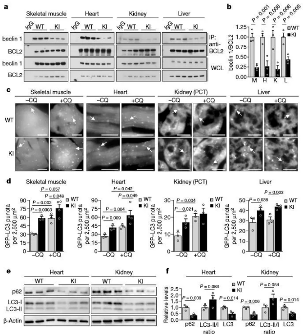 Fig. 1 | beclin 1–BCL2 上的 beclin 1(F121A) 突变的互动与基底自噬的影响。图片来自论文自噬是一种演化上保守的蛋白质降解途径——消除功能失调的细胞成分并循环利用其组成成分,它有助于延长模型生物的寿命;然而,它在哺乳动物寿命方面所发挥的作用仍鲜为人知。美国德克萨斯大学西南医学中心的 Beth Levine 及其同事先前曾表明,蛋白质 beclin1 发生特定突变会增加小鼠大脑和肌肉中的细胞自噬,而且还提高了阿尔茨海默病小鼠模型的认知功能。现在,他们报告说,这些小鼠不仅寿命延长,健康寿命也延长了,因为各种老化相关表型(如心脏病和肾脏疾病以及肿瘤发展)减少了。相同的 beclin1 突变也能够解决因抗老化蛋白质 klotho 不足而引起的小鼠的早期死亡和不育问题。作者总结表示,这种突变通过从负调节因子中释放 beclin1 发挥作用,可能是哺乳动物增加细胞自噬、预防过早衰老、延长健康寿命和寿命的一种有效机制。https://www.nature.com/articles/s41586-018-0162-7