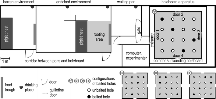 动物:在断奶前两天,从十个不同的窝中选出20头健康仔猪。十窝仔猪中选择最接近平均体重的两头雌性仔猪。. 每窝仔猪,其中一个是随机分配到一个贫瘠的环境,其他被分配到一个丰富的环境。在4周龄,动物断奶,并转移到实验房。每个条件下的十只动物都被安置在一起。两个环境(贫瘠和富饶)并排位于自然通风的稳定与大天窗自然光下。这两组动物看不见,却能听到和闻到彼此的气味。每天记录稳定温度,温度范围在8℃到20℃之间。收音机每天在7:00至19:00之间播放电台12小时的流行音乐。贫瘠的环境是一层混凝土地面,400×500厘米。. 它有一个有橡皮床垫的130个360公分的猪窝,两个加热灯,一个橡胶咬杆,和一个饮用和喂养的地方。富集环境的比贫瘠环境大两倍,面积850×530cm,生根面积360×270cm,充满泥炭。每周添加新泥炭(150 L)。一层稻草铺盖铺在水泥地面上。每天添加新鲜稻草。此外,还提供了四种不同的玩具之一——木棍、球、黄麻袋和绳子——它们每天都随机变化。有一个稻草的猪窝,还有两个暖灯、两个饮水处、一个喂食处和两个橡皮咬杆。此后,为了增加寻找全息板任务中隐藏诱饵的动机,在试验前大约早上7:30给猪喂1/3日食量,在试验后大约16:00给猪每天喂剩余2/3食物。
