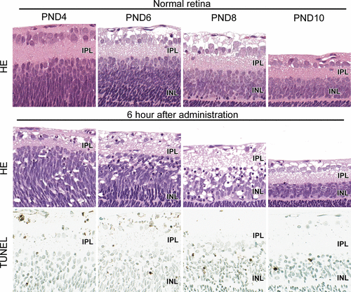 摘要:神经递质谷氨酸引起人视网膜兴奋性毒性。在新生大鼠中,谷氨酸诱导的视网膜损伤程度取决于给药的年龄。为了阐明谷氨酸对视网膜不同发育阶段的敏感性,我们观察了谷氨酸诱导的视网膜损伤和出生后(PND)各天谷氨酸靶细胞。PNDS 1至14新生大鼠接受单次皮下注射L-谷氨酸。在给药后6小时分析以固缩和末端脱氧核苷酸转移酶介导的dUTP地高辛缺口末端标记阳性细胞核为特征的视网膜细胞凋亡,并在PND 21上评价视网膜的顺序形态学特征。PND 21大鼠视网膜变薄。PND 8大鼠视网膜变薄最为严重,凋亡细胞数也达到高峰。在PND 14给药的大鼠没有观察到变薄。在内核层,谷氨酸靶细胞主要为无长突细胞,PND 8对双极细胞和水平细胞有损伤。PND 8的视网膜中央病变较周围视网膜更为严重。我们的研究表明谷氨酸诱导的视网膜兴奋毒性和谷氨酸靶细胞对每个PND的形态学影响,提示谷氨酸引起视网膜损伤依赖于发育阶段。关键词:谷氨酸 新生大鼠 视网膜损伤 兴奋毒性 出生后天数简介:谷氨酸,视网膜中的兴奋性神经递质,已知会引起兴奋毒性,这种现象中神经元细胞死亡发生在过度兴奋性神经递质之后。兴奋毒性与中风、低血糖、创伤、癫痫和慢性神经退行性疾病有关,如获得性免疫缺陷综合征痴呆综合症、肌萎缩性侧索硬化症和阿尔茨海默病。在视网膜中,兴奋性毒性被认为在视网膜缺血/再灌注损伤中起重要作用,在青光眼的神经元丢失中起重要作用。谷氨酸致兴奋毒性动物模型已证实由内界膜组成的内视网膜向内核层变薄。表明谷氨酸不仅损伤RGC,还损伤其他视网膜内细胞。然而,谷氨酸对视网膜内细胞的兴奋毒性作用还没有阐明。谷氨酸诱导新生大鼠视网膜损伤是谷氨酸诱导视网膜兴奋性损伤的动物模型。新生大鼠的视网膜发育不完全,大约需要3周才能成熟,视网膜损伤的程度取决于服用谷氨酸时的年龄。本实验通过在出生后各天皮下单次注射1-谷氨酸(PND)观察新生大鼠视网膜兴奋性毒性,并通过形态学和形态计量学方法评价谷氨酸诱导的视网膜损伤和各发育阶段的靶细胞。动物:购买SD孕鼠,自由饮水和采食。在实验1中,新生SD大鼠分为14个给药组,每组2只。每组动物称重,每克体重2.4 mol/L谷氨酸,剂量10μl皮下注射1次。注射日期从PND 1到14不等(例如,第1组大鼠只注射PND 1,而第14组大鼠只注射PND 14)。动物从接受注射开始,每天观察直到PND21。所有组均在21天时结束异氟醚麻醉下放血,取出眼睛以作进一步分析。未经给药的正常动物在PNDS 1至14或21终止,并摘取眼睛。在实验2中,新生SD大鼠分为4个给药组,每组6只。每组动物称重,皮下注射10ul的每克体重 2.4mol/L谷氨酸钠。注射的时间在PNDS 4, 6, 8和10。给药后6小时取眼进行凋亡细胞分析。组织固定:实验1用4%磷酸缓冲戊二醛固定右眼,5%磷酸缓冲福尔马林后固定,石蜡包埋,3um切片,HE染色。左眼后部用10%磷酸缓冲福尔马林固定1小时,包埋于最佳切削化合物中,保存在-80℃直至用于免疫组织化学。实验二用4%磷酸缓冲戊二醛固定每个PND的2只大鼠的眼睛,5%磷酸缓冲福尔马林固定后HE染色。用10%磷酸缓冲福尔马林固定每个PND的2只大鼠的眼睛,石蜡包埋,末端脱氧核苷酸转移酶介导的dUTP地高辛缺口末端标记。2只大鼠后眼用10%磷酸缓冲福尔马林固定1小时,冷冻保存在30%蔗糖中,并嵌入OCT化合物中。冷冻保存组织切片采用间接荧光法进行免疫组织化学标记。分别在100℃和105℃柠檬酸缓冲液中孵育15分钟,进行Chx10和Pax6免疫染色的抗原回收。在pH为7.6的50 mM TrI缓冲盐水(TBS)中,1%牛血清白蛋白(BSA)中阻断视网膜切片20分钟。初级抗体在TBS中用1%BSA稀释,组织切片在4℃下与抗体隔夜孵育。在TBS洗涤后,在室温下同二抗孵育1小时。包括兔抗小鼠免疫球蛋白G(IgG)或山羊抗兔IgG与Alexa TM 488结合(绿色荧光)。用TUNEL方法标记凋亡细胞。测量视网膜总厚度(从内结膜到色素上皮)和视网膜内厚度(内界膜至内核层)。在中央视网膜(距视盘约500um)和外周视网膜(距睫状体两侧约500um)处进行测量,计算视网膜内比率[(视网膜内厚度/视网膜总厚度)×100]。结论:视网膜中央区的组织病理学:我们通过对PND 21进行组织病理学检查,评估了PNDs 1到14 新生大鼠视网膜对谷氨酸的年龄依赖性敏感性。PND 1大鼠无明显变化。然而,在PND 2给药的大鼠视网膜内,与正常大鼠相比,视网膜轻度变薄。在PND 6给药的大鼠中,内核层仅能识别2-3层核,而正常大鼠有4-5层核。此外,神经纤维层至内侧丛状层表现出变薄。在PND 8给药的大鼠视网膜中央视网膜层几乎完全缺失。PND 10大鼠视网膜内变薄较PND 8大鼠轻。PND 14给药组大鼠视网膜内层厚度与正常对照组相同。在任何PND上用L-谷氨酸给药的大鼠外视网膜未见变化。首先在PND 2给药的大鼠中观察到谷氨酸诱导的视网膜中央变薄,在PND 8给药的大鼠中最明显,随后给药的大鼠变薄减弱。视网膜内的初始变化:为了研究单次给予谷氨酸对视网膜的初始改变,在PNDS 4, 6, 8和10给药后6小时进行病理组织学检查。视网膜内选择性地出现许多核团,其中一些为TUNEL阳性。大多数核团位于内核层的内部区域。PND 8大鼠核固缩核数出现高峰,PND 10大鼠可见少量核团。固缩核数目与视网膜内层变薄程度相关,提示谷氨酸诱导的细胞凋亡是视网膜内层变薄的原因。核内层的免疫组织化学分析:由于内核层由多种类型的细胞组成,所以对PND 21进行免疫组织化学